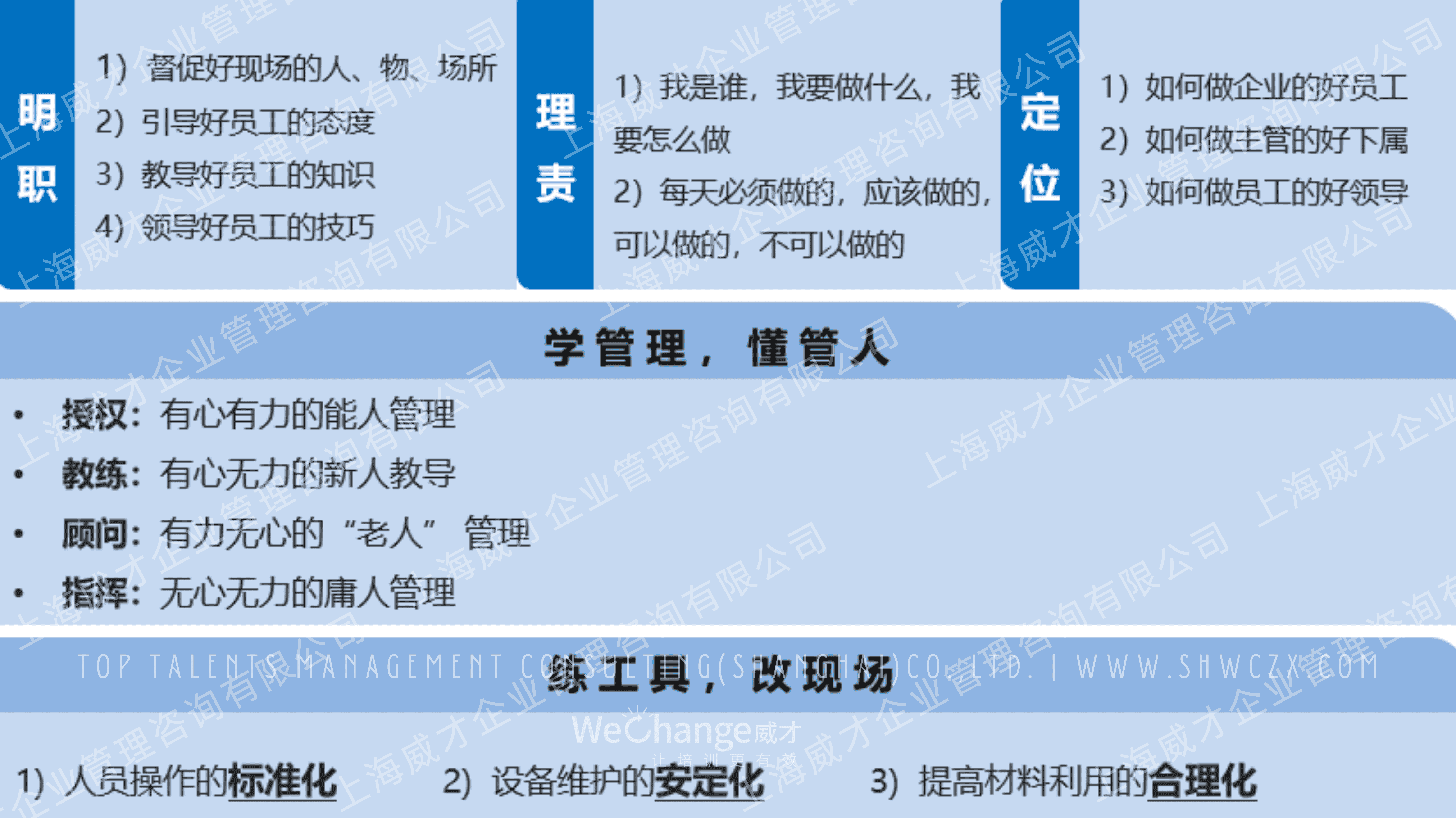 2、沒有經(jīng)過系統(tǒng)訓(xùn)練的一線班組長總是在幫企業(yè)制造問題,系統(tǒng)訓(xùn)練過的都在幫企業(yè)解決問題,系統(tǒng)訓(xùn)練過的一線班組長會讓上級的思想強(qiáng)化,功能弱化,沒有系統(tǒng)訓(xùn)練過的則反之。