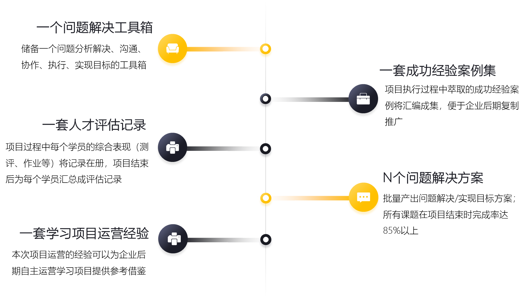本項目融合了行動學(xué)習(xí)、引導(dǎo)技術(shù)、案例情景、模擬訓(xùn)練等核心元素和工具,并注重訓(xùn)前后調(diào)研,訓(xùn)中跟進(jìn),訓(xùn)后優(yōu)化行為,從而達(dá)到優(yōu)化思維、解決問題,改善績效,同時提升能力的培訓(xùn)目的!