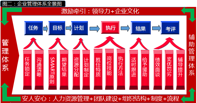 所以,作為管理者,要管理好人,首先要管理好自己(如領導力提升等),然后才是管理好員工(如圖二:企業管理體系全景圖所示),重在組建好團隊. 管理好過程,管理出結果。