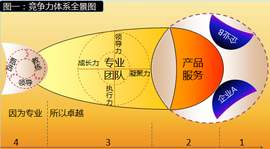 現代社會商場如戰場。如【圖一:企業競爭力體系全景】所示,兩個企業AB之間的競爭,表面上是產品與服務的競爭,實際上是專業團隊之間的競爭,即領導力與執行力. 成長力與凝聚力之間的競爭,本質上是領導干部的競爭. 人才甄選與員工教練能力的競爭。